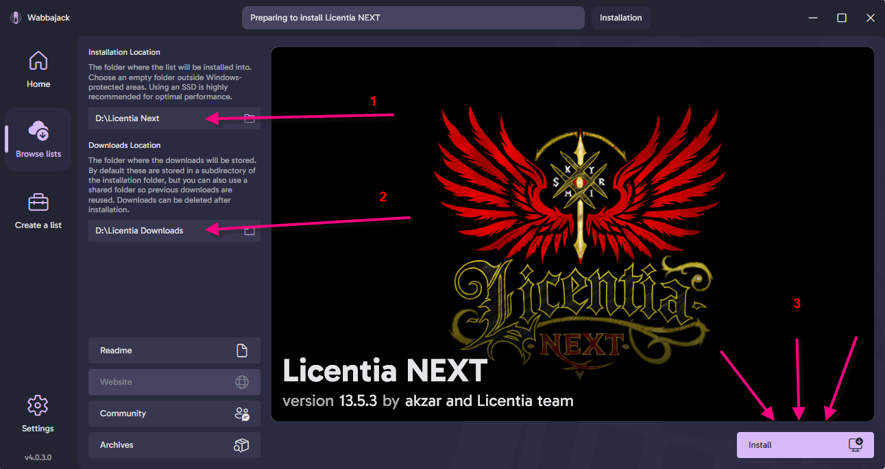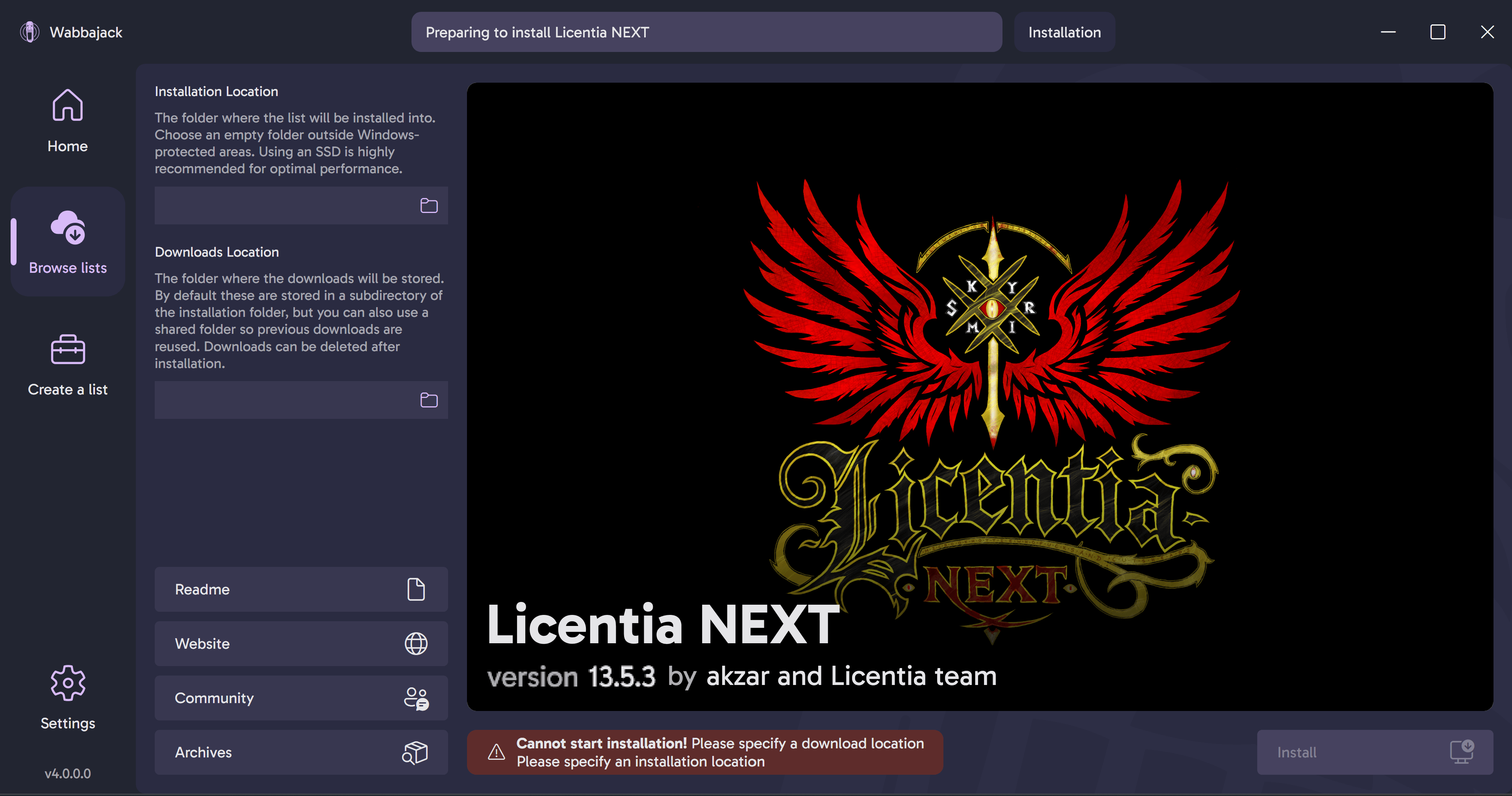 Program FilesorProgram Files (x86), or the installation would fail.Also, it's STRONGLY RECOMMENDED that these folders are located on a Solid State Drive (SSD) rather than a Hard Disk Drive (HDD) for performance reasons. That's especially important for the installation folder, as the modlist would run from there. Downloads folder can be on a slower drive if necessary (it would only be used during installation and affect only the installation process speed).